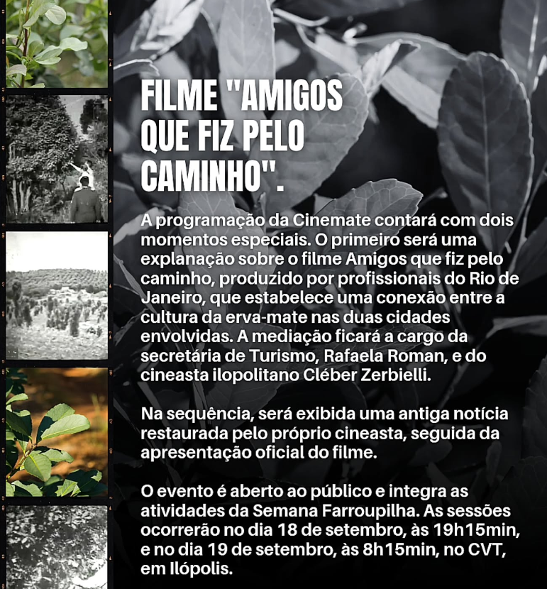 “A primeira edição do Cinemate chega com uma programação especial e imperdível! A obra celebra a erva-mate como símbolo de identidade, memória e amizade entre gerações. Um evento que reforça a tradição local de Ilópolis e que contribui para o desenvolvimento do turismo cultural da região”, finaliza Rafaela.