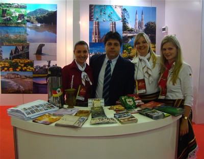 As turismólogas Lizeli Bergamaschi, Samanta Regina Chiesa e Juliana Jasper, da Associação dos Municípios de Turismo da Região dos Vales (Amturvales), estiveram no último fim de semana (dias 19, 20, 21 e 22 de novembro), no Festival do Turismo de Gramado.