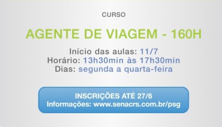 O turismo é uma área em expansão, principalmente com a chegada de eventos como a Copa do Mundo ao Brasil. Para os interessados em atuar neste segmento, a Escola de Educação Profissional Senac Lajeado está com turma aberta para o curso de Agente de Viagem. A capacitação gratuita é oferecida através do Programa Senac de Gratuidade (PSG). Os interessados têm até o dia 27 de junho para realizar inscrição, através do sitewww.senacrs.com.br/psg.